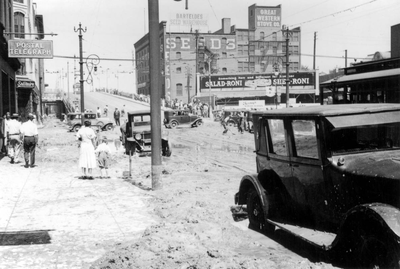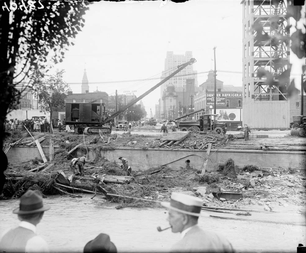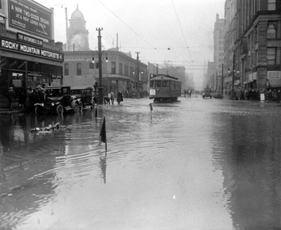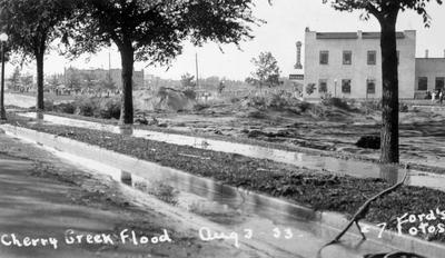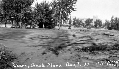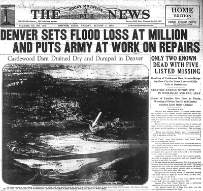 What: After two days of heavy rain, the Castlewood Canyon Dam began to show signs of failure at about 1:30 am on the morning of August 3rd, 1933. The first break occurred on the East end of the dam. By 7:00 am the 15 to 20 foot wall of water reached Denver. More than 1 billion gallons of water were released down stream. Bridges on Champa, Colorado Boulevard and Stout Street were swept away. While only two people died, property damage was extensive.